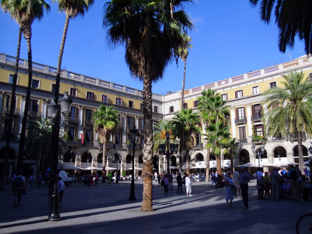 After breakfast we returned to Placa d’Espanya where we had seen the Font Magica light and sound show. It all looked very different during the day but nonetheless beautiful. Our next stop was along to the seafront and a walk from Port Vell, home of the large marina to Plaza Portal de La Pau…